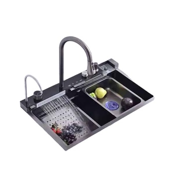 Fregadero de doble cuenco con pantalla Digital moderna con grifo de cascada de acero inoxidable negro Nano accesorios de diseño de inserción de lluvia